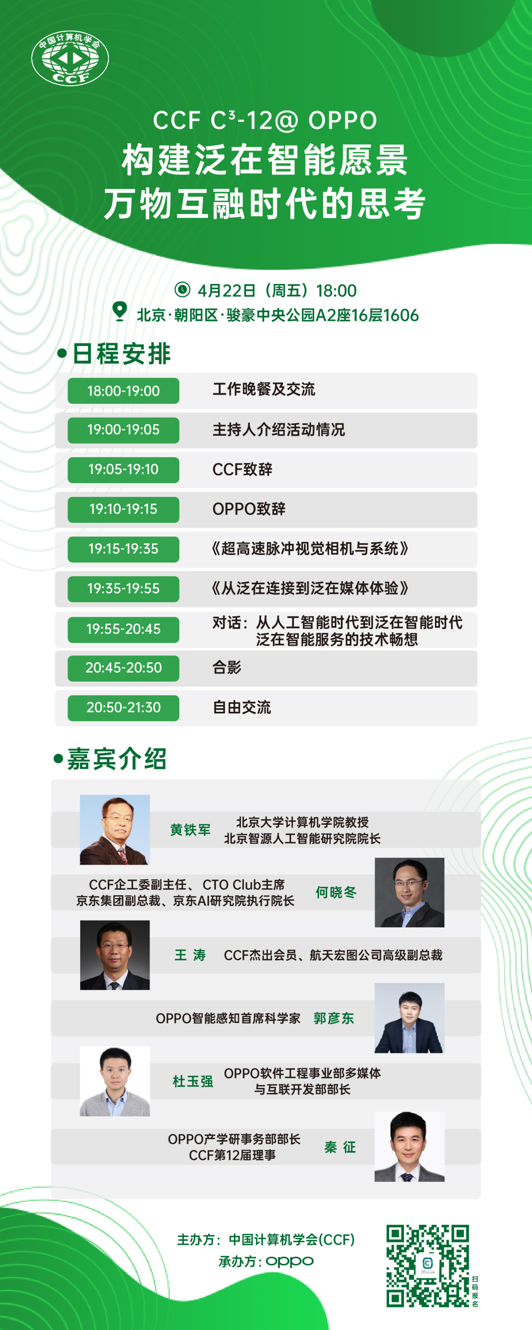 4月22日本周五晚(18:30-21:30),CCF C³第十二期主题为“构建泛在智能愿景,万物互融时代的思考”的活动将在OPPO北京举行。CCF C³活动旨在联结企业CTO及高级技术人才和资深学者,以一个技术话题为核心,面向企业技术专家的热门技术和战略分享会。