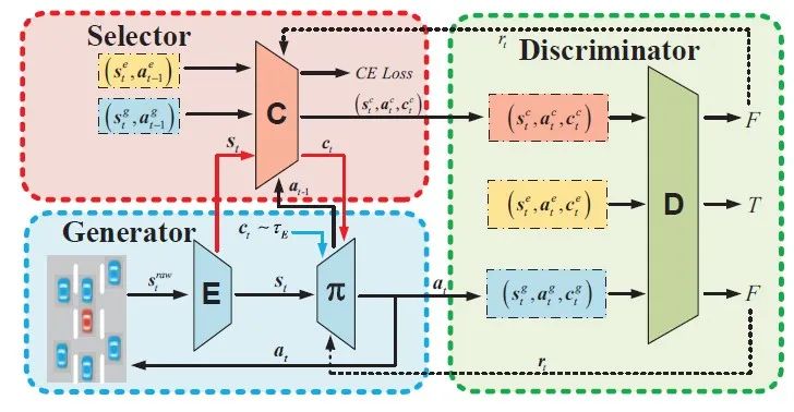 模仿学习是一种基于专家示教重建期望策略的方法,一直是AI领域的研究热点。为了提升模仿学习的通用性和在实际工程中的应用,相关的研究方向吸引了大量学术和工业界人士,其中利用多模态模仿学习提升模仿学习效果是重要的方向之一。例如,应用于自动驾驶中的驾驶行为学习,真实驾驶员示教数据由于驾驶技能和行为习惯的多样性呈现多种模态并服从不同的分布,如果直接利用行为克隆(Behavioral Cloning,BC)或逆向强化学习(Inverse Reinforcement Learning,IRL)容易导致模态坍塌问题(mode collapse problem),因缺乏发现和区分示教数据中的模态变化的能力。为了针对多模态示教数据进行有效的模仿,我们提出了一种基于生成对抗模仿学习(Generative Adversarial Imitation Learning,GAIL)的多模态模仿学习算法框架(图3),称为Triple-GAIL,通过对模态选择和行为模仿联合学习并利用模态选择器增量式生成数据促进模态区分优化模仿效果。Triple-GAIL在GAIL的基础上增加了一个模态选择器(Selector)用于区分多个模态,并和生成器(Generator)一起持续生成状态-动作-模态数据序列,达到数据增广的目的,而判别器(Discriminator)用于区分状态-动作-模态数据序列是否来自于专家示教数据。与已有多模态模仿学习方法相比,Triple-GAIL既可以直接通过指定模态生成行为轨迹,也可以直接利用模态选择器基于历史数据判断模态。