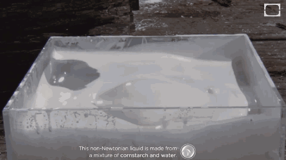 非牛顿流体,是指不满足牛顿黏性实验定律的流体,它广泛存在于生产生活和大自然之中。图中的玉米淀粉糊便是最常见的非牛顿流体之一,它“遇强则强”,施加的外力越大,它便会表现得越“坚硬”。当然还有很多其它种类的非牛顿流体,性质也千差万别。