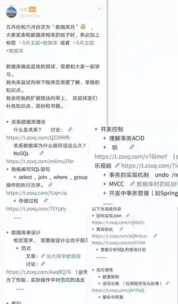 具体办法是和球友一起列出知识点,好书和学习资料,球友们可以针对这些知识点展开讨论,互相学习。例如: 5 月和6月的主题是数据库。