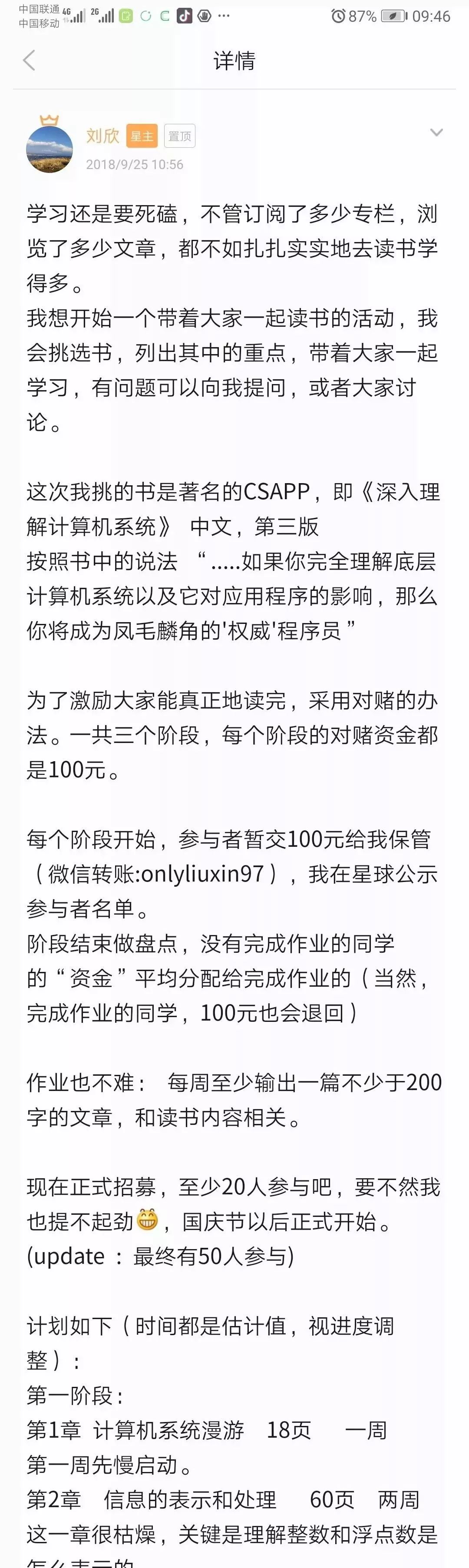 规则很简单: 参与这个活动的人需要交付100元“赌资”,每周要输出一篇读书笔记,达成目标的同学会退还100元, 没完成的同学的资金就给别人发红包了。
