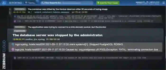 Zebrium 的 ML 生成了一份 根本原因报告,其中包含少数几行日志以及如下 GPT-3 描述。"数据库服务器被管理员停止"。这个简单的句子足以即刻解释问题的性质。