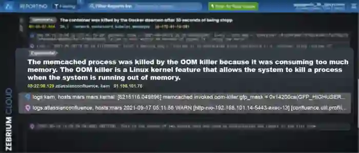 在这个案例中,Zebrium 的 ML 找到了十几条日志,表明服务器遇到了内存溢出的情况。