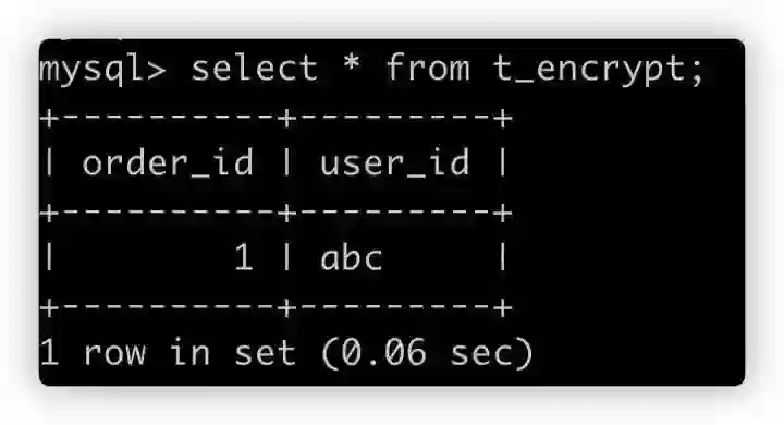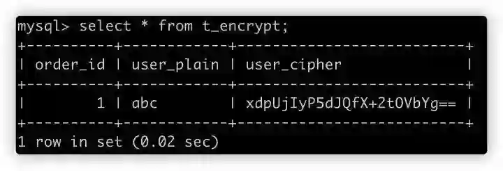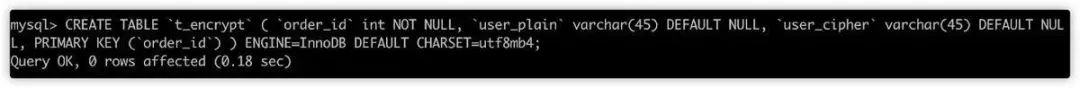 CREATE TABLE `t_encrypt` ( `order_id` int NOT NULL, `user_plain` varchar(45) DEFAULT NULL, `user_cipher` varchar(45) DEFAULT NULL, PRIMARY KEY (`order_id`) ) ENGINE=InnoDB DEFAULT CHARSET=utf8mb4;