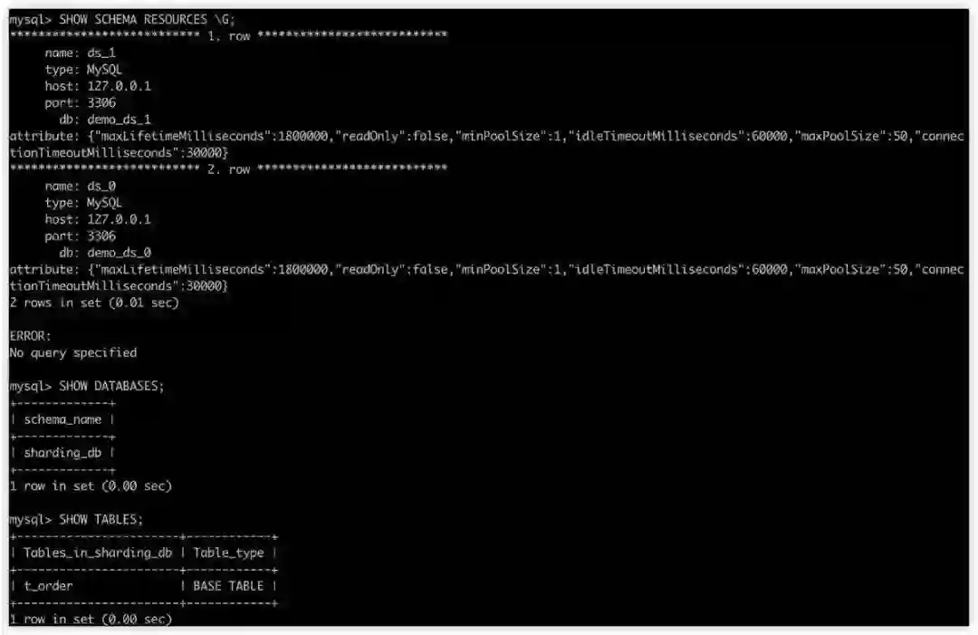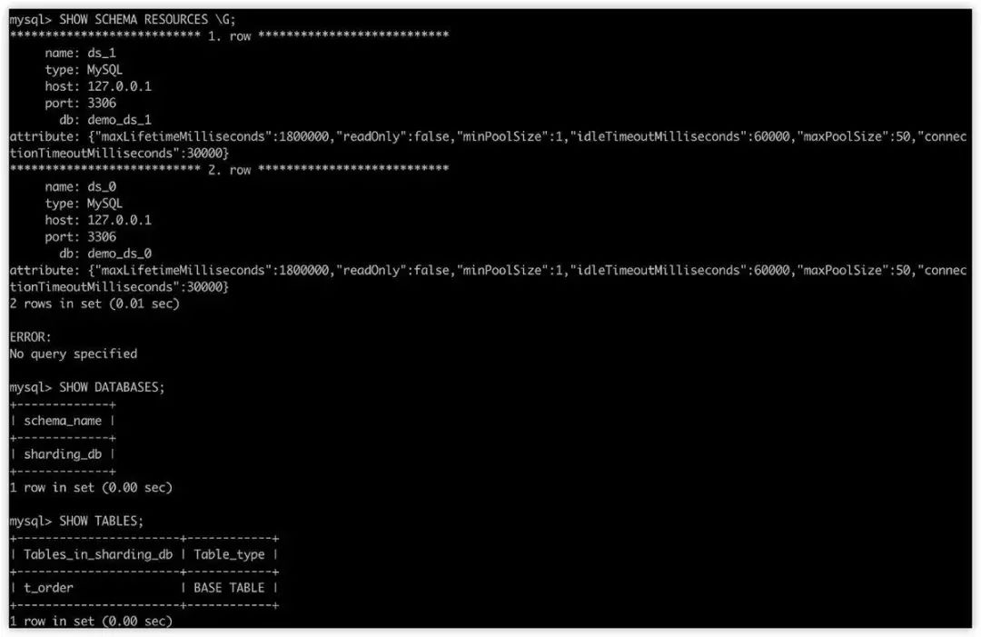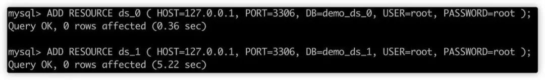 ADD RESOURCE ds_0( HOST=127.0.0.1, PORT=3306, DB=demo_ds_0, USER=root, PASSWORD=root );ADD RESOURCE ds_1 ( HOST=127.0.0.1, PORT=3306, DB=demo_ds_1, USER=root, PASSWORD=root );