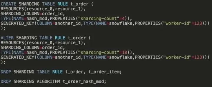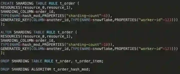 CREATE SHARDING TABLE RULE t_order( RESOURCES(ds_0,ds_1), SHARDING_COLUMN=order_id, TYPE(NAME=hash_mod,PROPERTIES("sharding-count"=4)), GENERATED_KEY(COLUMN=order_id,TYPE(NAME=snowflake,PROPERTIES("worker-id"=123))) );
