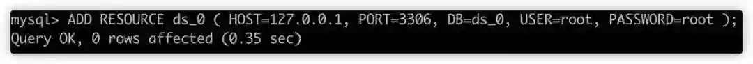 ADD RESOURCE ds_0 ( HOST=127.0.0.1, PORT=3306, DB=ds_0, USER=root, PASSWORD=root );
