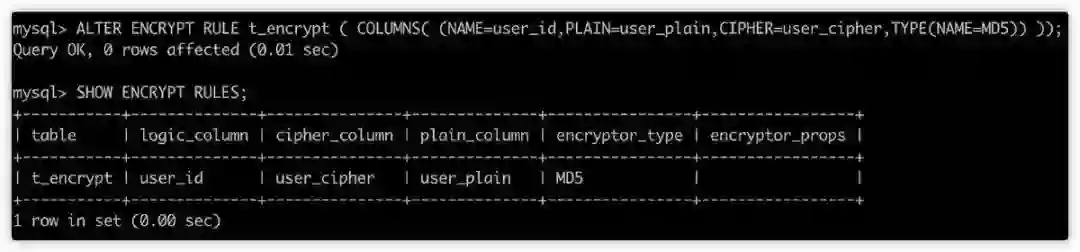 ALTER ENCRYPT RULE t_encrypt ( COLUMNS( (NAME=user_id,PLAIN=user_plain,CIPHER=user_cipher,TYPE(NAME=MD5)) ));SHOW ENCRYPT RULES;