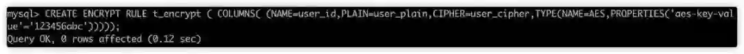 CREATE ENCRYPT RULE t_encrypt ( COLUMNS( (NAME=user_id,PLAIN=user_plain,CIPHER=user_cipher,TYPE(NAME=AES,PROPERTIES('aes-key-value'='123456abc')))));