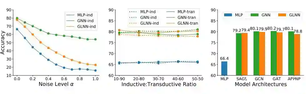 我们通过在节点特征(node features)中加入不同程度的高斯噪声以减少其与标签的相关性。我们用 表示添加噪声的程度。实验结果如图 4-左图所示,随着 的增加,MLP 和 GLNN 的性能比 GNN 下降得更快。当 较小时,GLNN 和 GNN 的性能仍然相当。