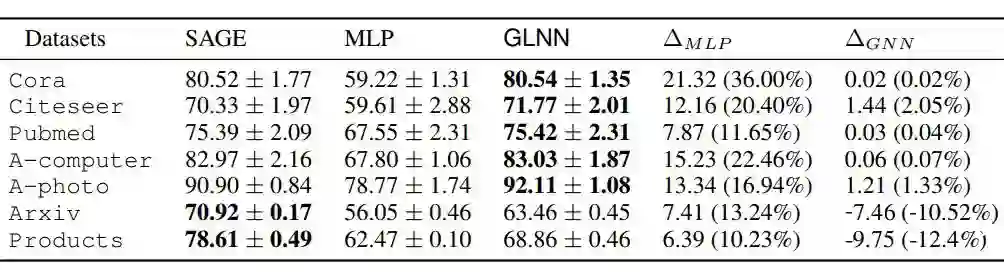 由于 GLNN 的模型非常简单,所以实验部分是这篇文章的重点,从各个角度证明并阐述了 GLNN 的有效性且有效的原因。实验部分主要是回答如下 6 个问题