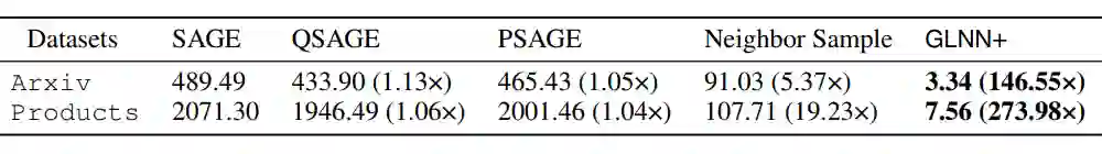 对于 GNNs 来说,邻居采样(neighbor sampling)也被用来减少延迟。所以在这一实验中,我们的基线(baseline)有SAGE、QSAGE(从 FP32 到 INT8 的量化 SAGE 模型)、PSAGE(有 50% 权重剪枝的 SAGE)、Neighbor Sample(采样 15 个邻居 fan-out 15)。实验结果如表 4 所示,GLNN 要比所有的基线快得多。
