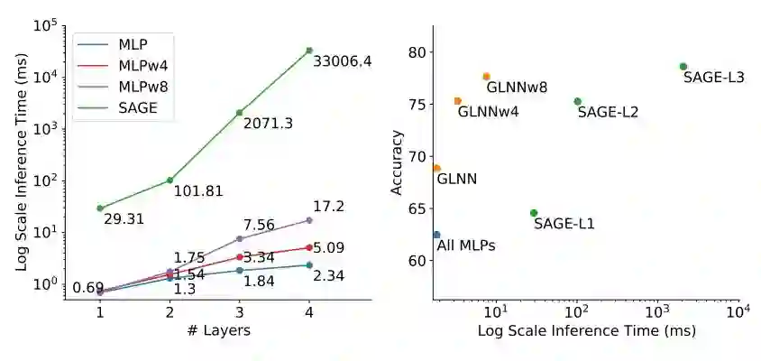 图 1 展示了 GNNs 随着层数的增加所需的邻居节点个数和推理时间呈指数级上升。反观 MLP,在相同的层数下,MLP 的推理时间会少很多,且只是线性增长。这一推理时间的差距可以解释 MLP 比 GNN 在业界用的更广泛的原因。