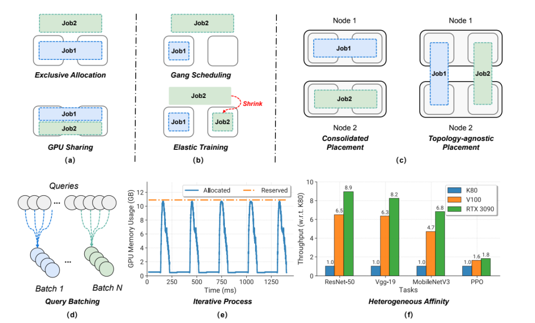 图2 训练和推断工作量的特征。(a)独占分配vs GPU共享。(b) Gang Scheduling vs弹性训练。(c)合并布局vs .拓扑不可知布局。(d)推理中的查询批处理机制。e)迭代过程:通过torch分配和保留GPU内存跟踪。profiler (ResNet-50 ImageNet分类任务)。(f)异构亲和(Heterogeneous Affinity): GPU各代之间的加速幅度在不同任务之间存在显著差异。