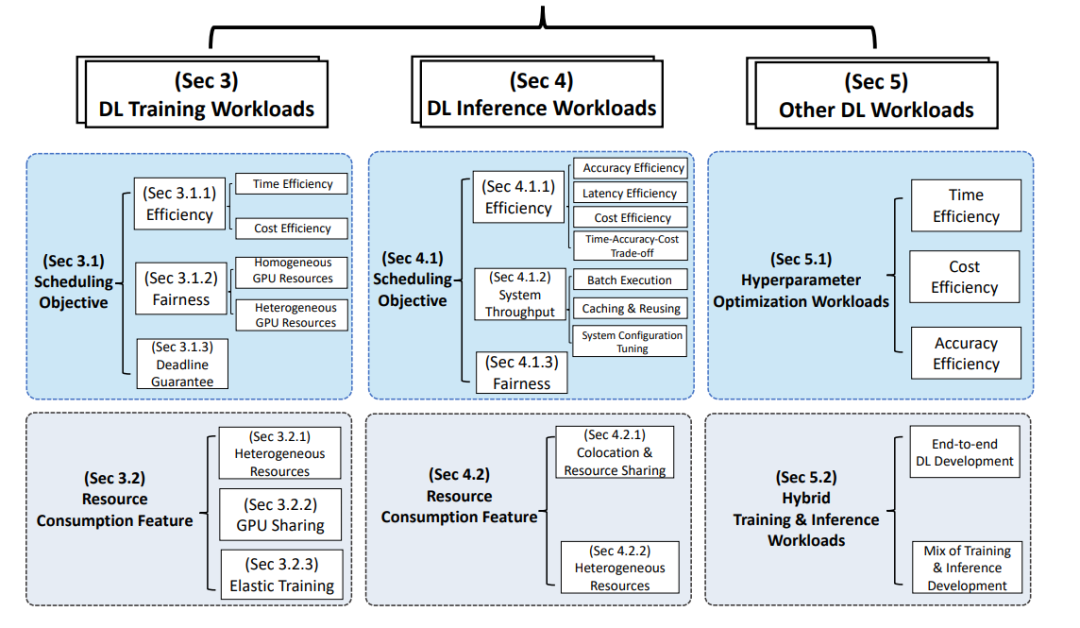 第2节描述了DL工作负载的独特特征以及GPU数据中心调度的挑战。它也说明了这次调研的范围。本次调研的主体部分如图1所示。具体而言,第3节和第4节分别基于调度目标和资源消耗特征对训练和推理工作量进行了详细的分类。第5节讨论了其他工作负载,例如超参数优化、混合训练和推理工作负载。在每一节的末尾也给出了这些研究的启示。第6节总结了这篇调研论文,并确定了调度程序设计的未来方向。