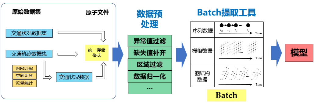 基于原子文件,LibCity 进一步构建了数据预处理和 Batch 提取工具,形成统一的数据处理流程,来将原始数据转换为标准化的模型输入——Batch。