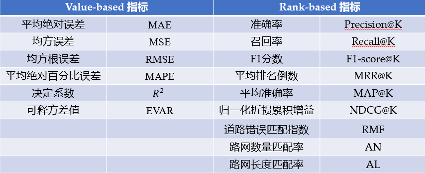 (1)Value-based 指标:用于回归任务的评估,如交通速度预测等。
