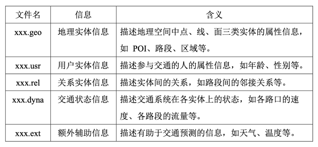 为了统一表示不同种类的交通数据,LibCity 定义了五种原子文件,即交通数据中的五种最小信息单元: