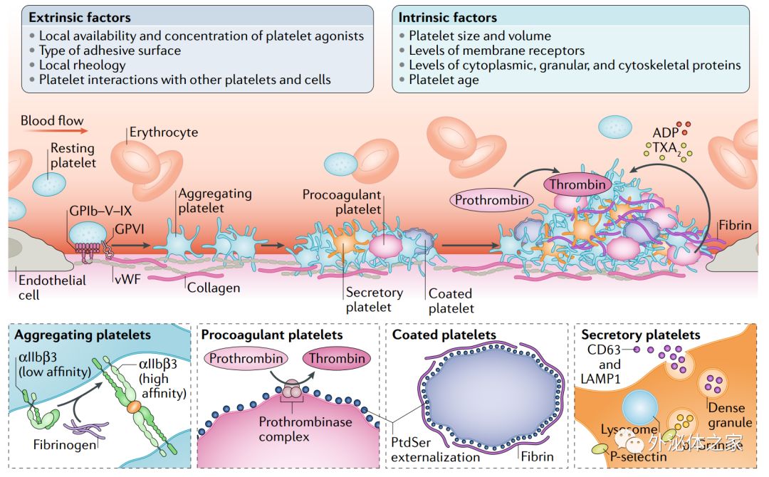 血小板,主要在骨髓中的巨核细胞不断产生的血细胞,不仅涉及止血和动脉血栓形成,还涉及其他生理和病理生理过程。这篇综述描述了血小板结构异质性的现有证据,以及对多种血小板功能的影响。参与血栓形成和持续凝血的血小板群体的信号传导过程是很好理解的。遗传方法提供了与正常止血相关的多个基因的信息,例如编码受体和信号传导或分泌蛋白的基因。作为高反应性和分泌性细胞,血小板可通过释放生长因子、趋化因子、凝血因子、RNA和细胞外囊泡来改变环境。另一方面,血小板也会适应环境。在疾病状态中,血小板可以被积极地引发以达到预激活状态。在发炎的血管壁处,血小板与白细胞和凝血系统相互作用,介导血栓炎症。目前的抗血小板治疗总是导致出血的副作用,如果针对特定的血小板反应、群体、相互作用或引发条件,新疗法可能更有益。在这些新概念和过程的基础上,该综述讨论了几种靶向血小板治疗的举措。