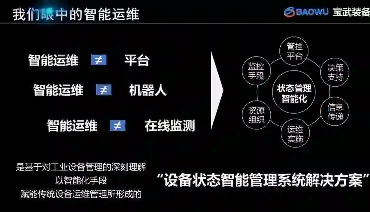 第三,智能运维 ≠ 在线监测。在线监测已有几十年的历史,它更多是从实时把握设备状态的角度去考虑,但智能运维实际上是对整个设备管理全流程进行重塑,去进行变革。