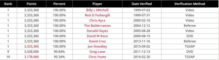 第一个拿下这个分数的,是一位叫做 Billy L Mitchell 的选手,记录创建时间为1999年7月3日。