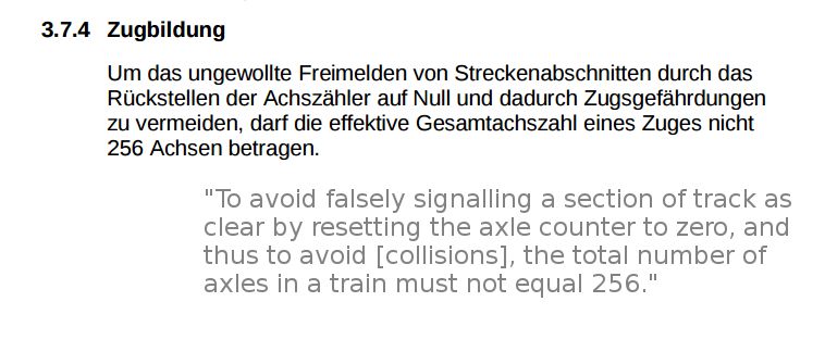 因为瑞士联邦铁路(SBB)使用的计轴器,就是在铁路上计算经过的火车的车轴数量的仪器也是8位的,它记到了256就会溢出变成0。