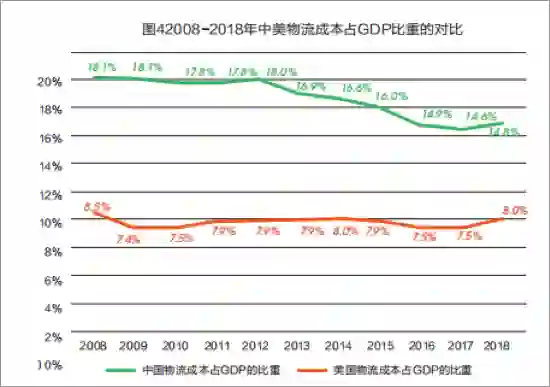 中国物流成本占 GDP 的比重,从十年前的 18% 降到了 14%,但还是比世界平均水平高不少。