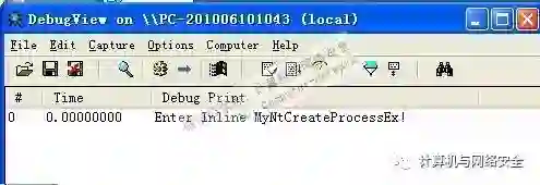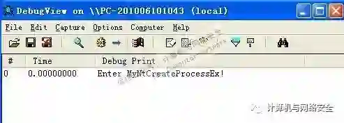 在DriverEntry()中,调用了HookCreateProcess()函数,该函数的作用就是将指针数组中NtCreateProcessEx()函数的地址替换为MyNtCreateProcess()函数的地址。而MyNtCreateProcess()函数是用来取代NtCreateProcess()函数的函数,在我们的函数中调用了一条KdPrint()用于输出的代码。整个Hook的过程非常简单,只要找到指针数组的位置,保存原地址后修改为新的地址即可。在代码中出现了两个函数,分别是UN_PROTECT()和RE_PROTECT()。这两个函数的作用是,禁止和开启CPU向标志为只读的内存页进行写入的操作。执行了UN_PROTECT后CPU可以向标志为只读的内存页进行写入操作。当写入完成好后,调用RE_PROTECT()函数恢复到原来的状态。把它放到虚拟机中,打开DebugView然后加载该驱动,加载成功后随便运行一个可执行程序,可以看到在DebugView中显示了在MyNtCreateProcess()中的输出了,如图1所示,说明我们的HOOK成功了。