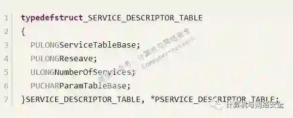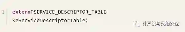 要想在驱动中获得该表,需要使用Notokrnl.exe导出的KeServiceDescriptorTable,将其定义如下: