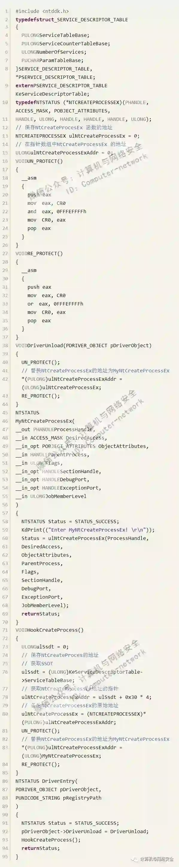 下面HOOK一个我们比较熟悉的函数,即创建进程函数NtCreateProcessEx()。该函数在指针数组的第0x30项(该编号根据系统版本的不同而不同,是系统相关的)。通过编程获取SSDT表,然后找到Native API的函数指针数组,然后修改其中第0x30项的内容为我们的函数地址,为了不影响进程的正常创建,在函数中调用NtCreateProcessEx()函数。代码如下: