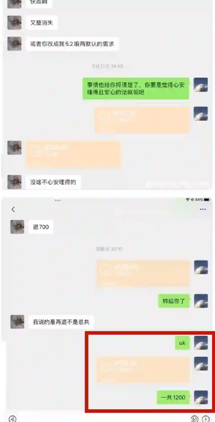 后续,该同学以枪手交的毕设令人不满意和枪手回消息不及时为由,要枪手退钱,并且表示因为闲鱼不支持代码此类商品的交易,如不退钱将直接去举报枪手。根据聊天截图显示,枪手向这位同学退了1200元钱。