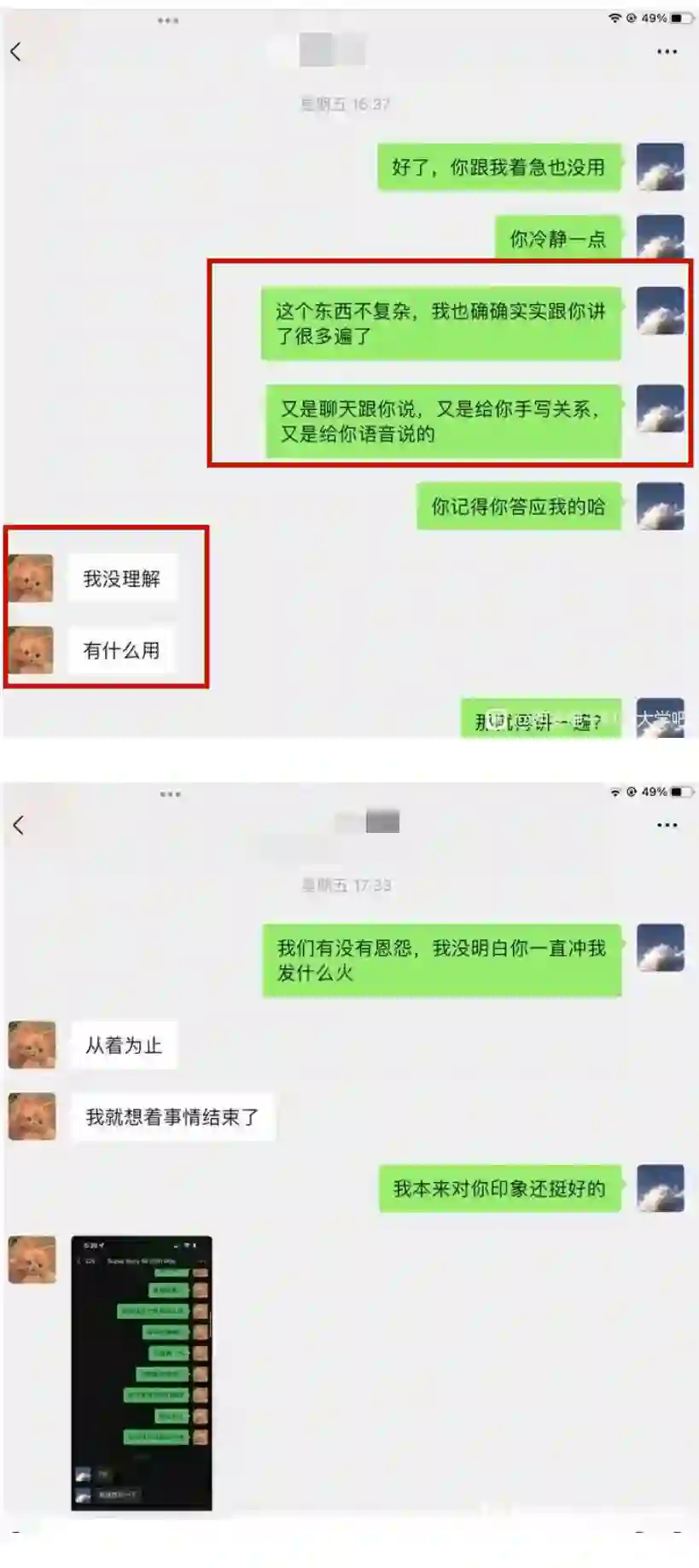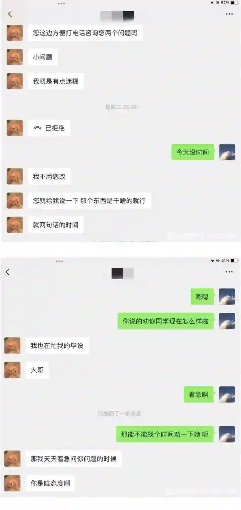 与此同时,在枪手这下单买毕设的还有雷某某的朋友,根据聊天记录显示,该同学和枪手也就交稿的毕设进行过沟通,枪手表示已经把她不懂的部分给她讲了,该同学表示,讲了自己也没明白,而且枪手回消息慢。