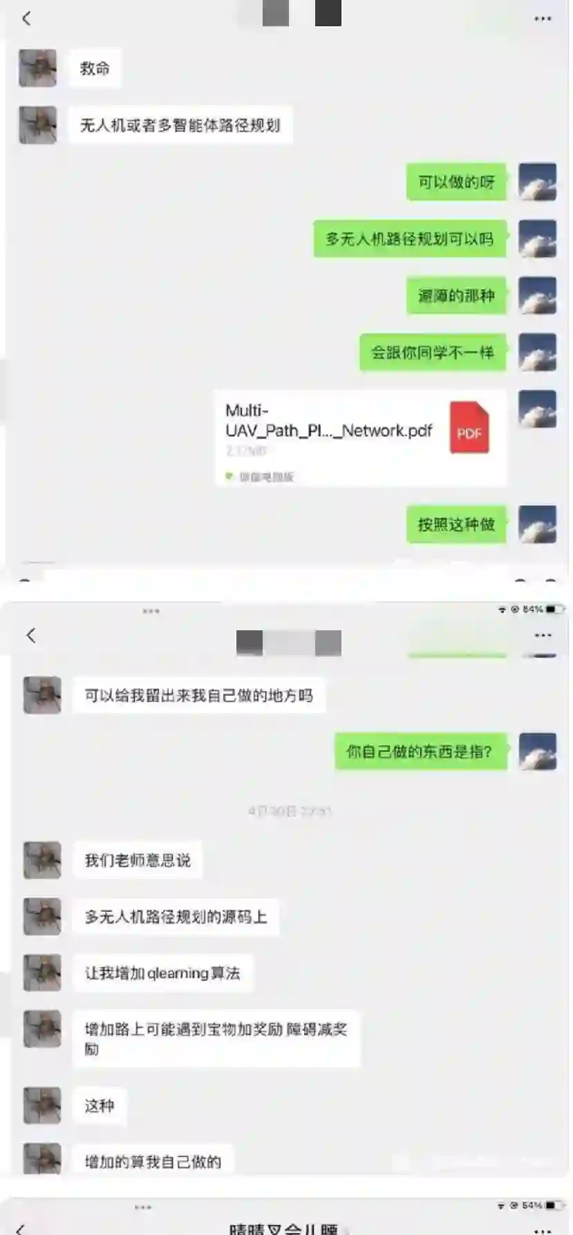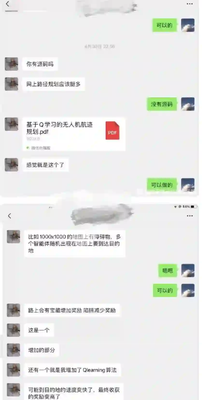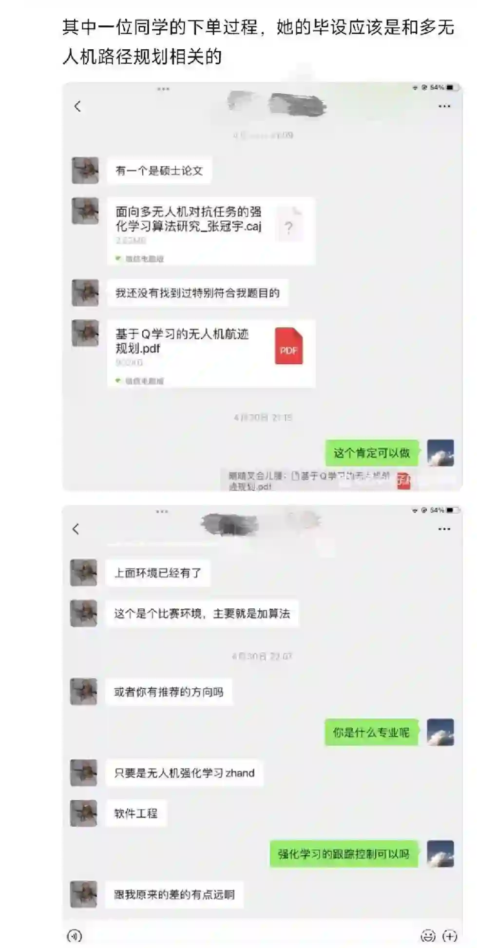 在帖子里,该“枪手”先放出来了一位同学的下单过程,表示她的毕设是和无人机路径规划相关的。