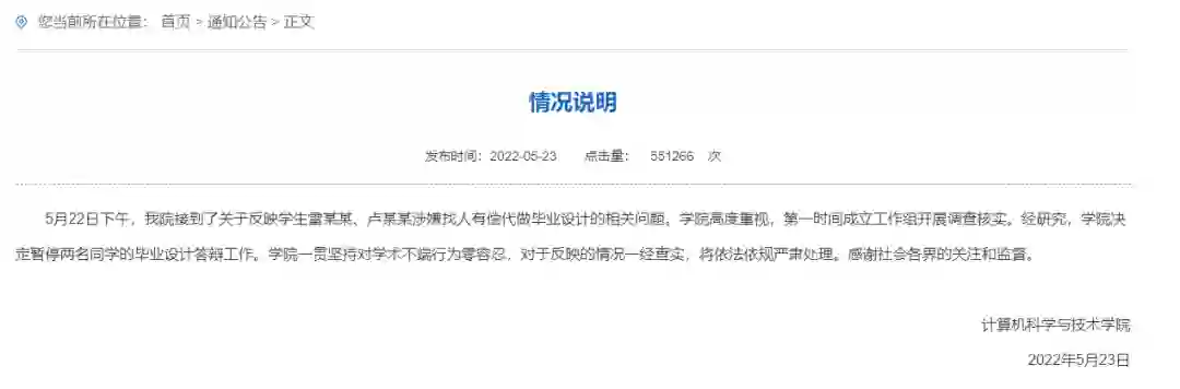 5月22日下午,我院接到了关于反映学生雷某某、卢某某涉嫌找人有偿代做毕业设计的相关问题。学院高度重视,第一时间成立工作组开展调查核实。经研究,学院决定暂停两名同学的毕业设计答辩工作。学院一贯坚持对学术不端行为零容忍,对于反映的情况一经查实,将依法依规严肃处理。感谢社会各界的关注和监督。