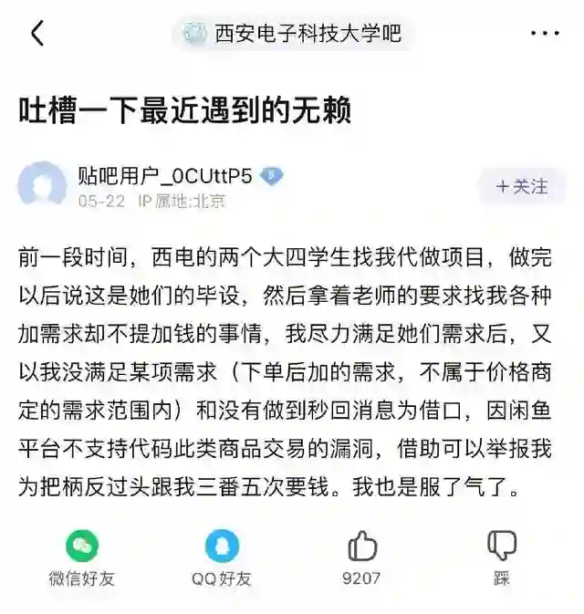 网帖表示,西电有两个大四学生找他代做项目,做完以后说是她们的毕设,然后拿着老师的要求找他做修改,但并没有加钱,可在自己尽力满足需求后,这2位学生又以他没有满足某项需求和回消息慢为理由,以闲鱼平台不支持代码此类商品交易的漏洞,以可以举报他为把柄三番五次跟他要钱,气不过的他发了此帖。