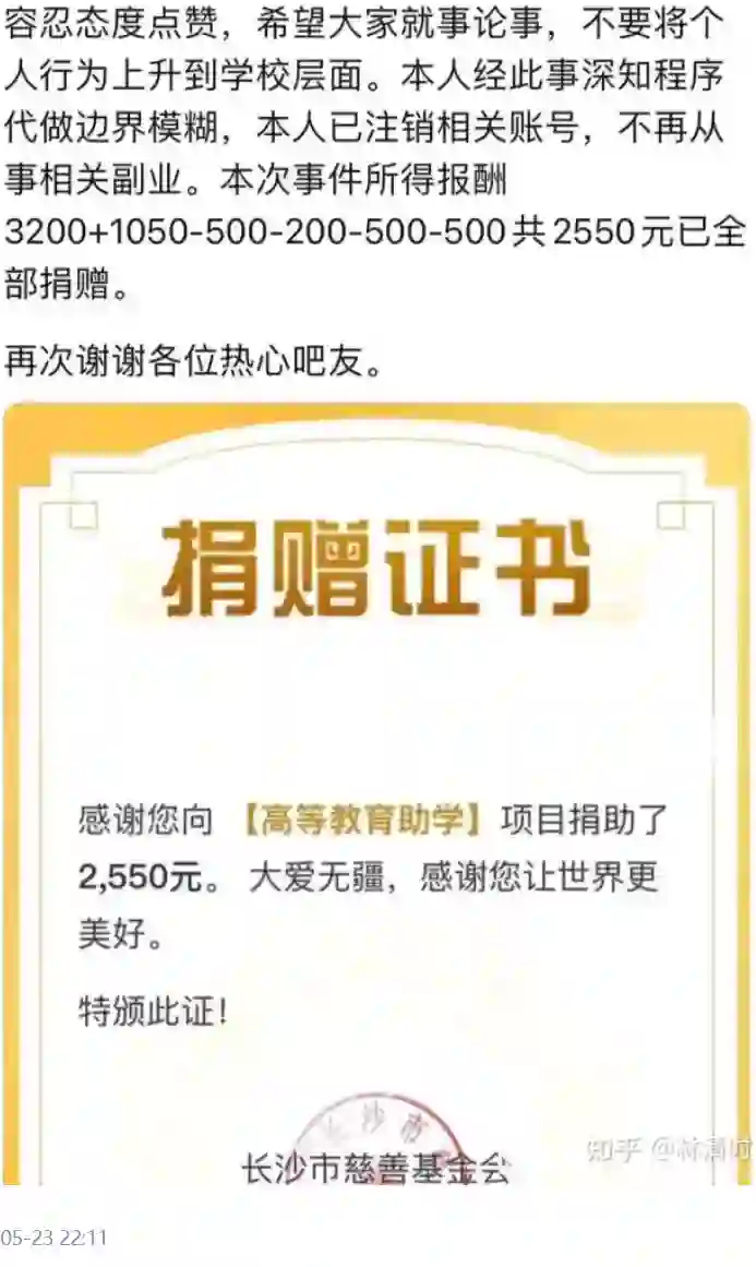 最后,根据网上的消息,此次的闲鱼枪手将剩下未退还给雷某某和卢某某的毕设报酬做了捐款处理,并表示已经深知程序代做边界模糊,已经注销相关账号,将不再从事相关的副业。