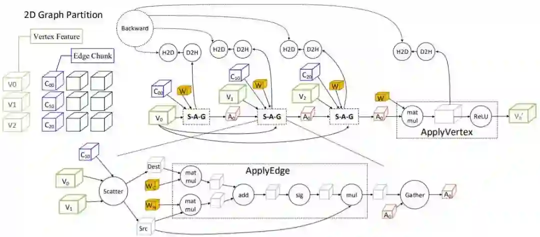 与在深度神经网络上的情况一样,高效使用 GPU 对 GNN 的性能至关重要,而且由于处理大型图结构的额外挑战,对 GPU 的使用就显得更为关键了。为了实现超越 GPU 物理限制的可扩展性,NGra 显式地将图结构划分(顶点和边数据)成块,将一个在 SAGA-NN 模型中表达的 GNN 算法转成了具有块粒度 operator 的数据流图,通过该数据流图,作者可以在单个或多个 GPU 上进行基于块的并行流处理。
