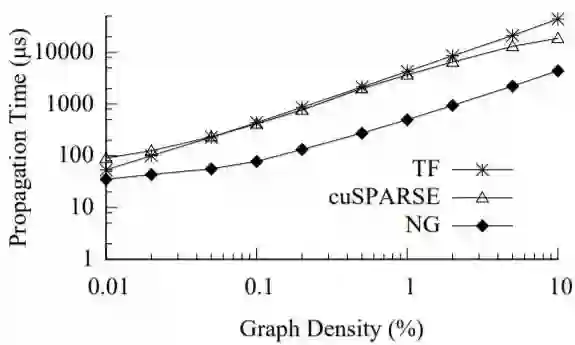 图 13:TensorFlow(TF),cuSPARSE,以及 NGra(NG)在不同密度的图上传播内核的时间。