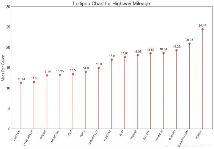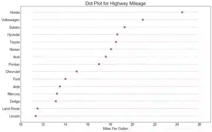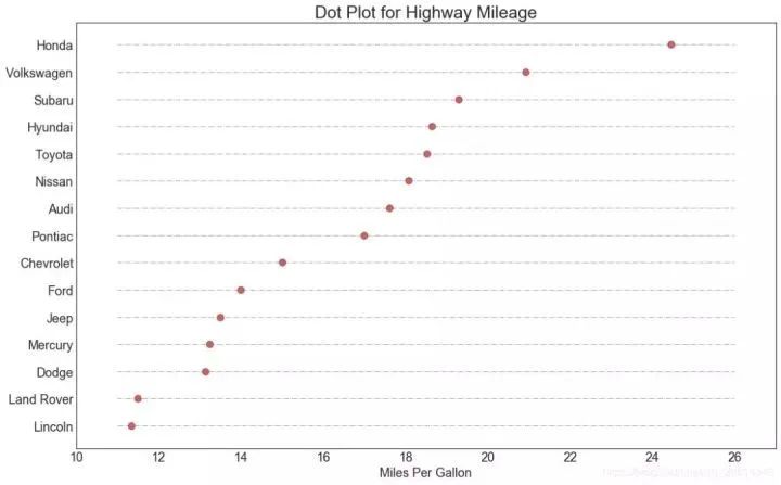 ax.scatter(y=i, x='cty', data=df_median.loc[df_median.index==make, :], s=75, c='firebrick')
