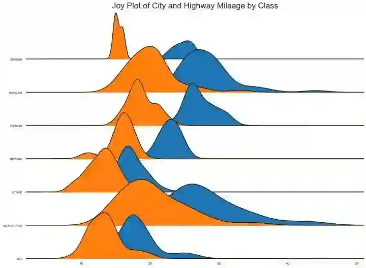 Joy Plot允许不同组的密度曲线重叠,这是一种可视化相对于彼此的大量组的分布的好方法。它看起来很悦目,并清楚地传达了正确的信息。它可以使用joypy基于的包来轻松构建matplotlib。