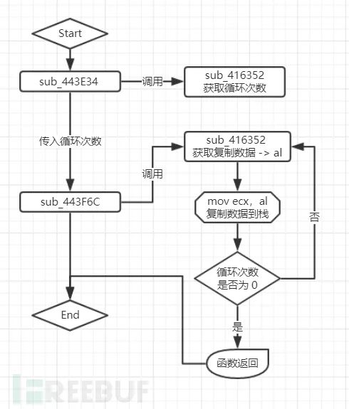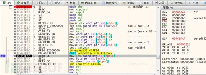 由于在调试漏洞前并没有找到该漏洞的 POC,所以需要手动的构造数据并且完成分析。幸运的是从阅读国外的几篇分析文档中捕获到了两个重要的信息,第一个是漏洞触发的函数为 sub_443F6C,且存在复制操作的指令为 mov [ecx],al。