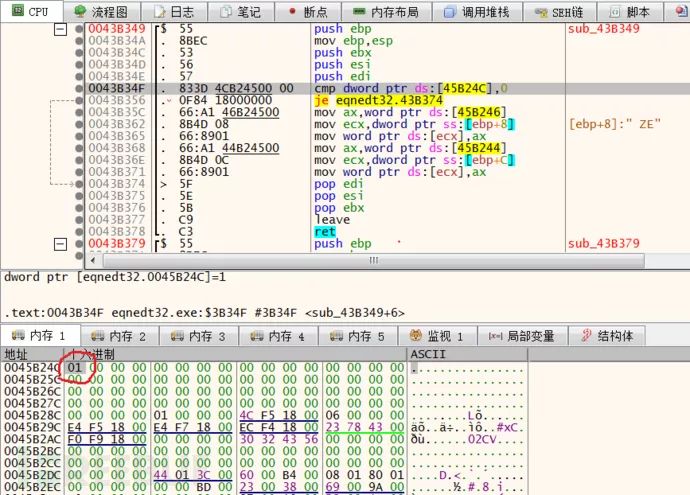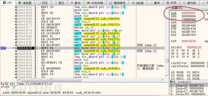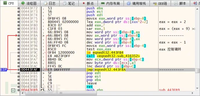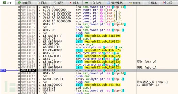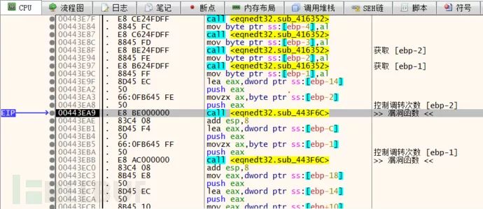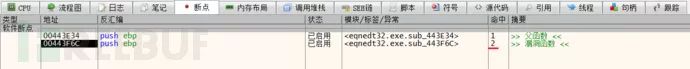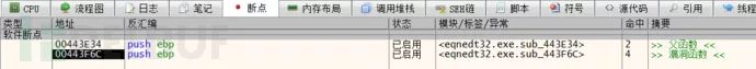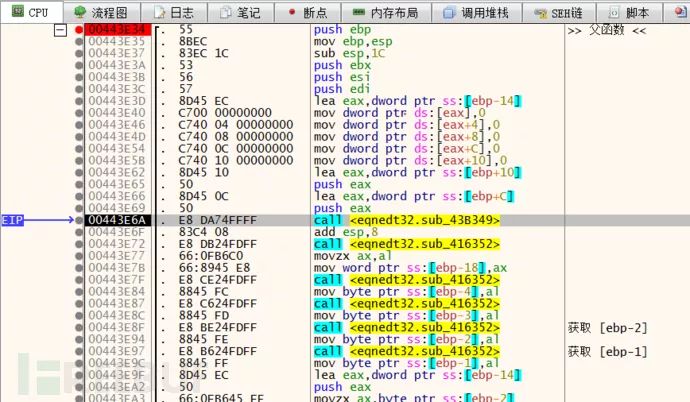 重新运行之后断在了 sub_443F6C 函数上,通过分析堆栈调用,发现其父函数为 sub_443E34,对这两个函数下记录断点,看看该函数与解析矩阵数据是否有关联。从下图中可以看出当只有一个矩阵公式时 sub_443E34 执行了一次。