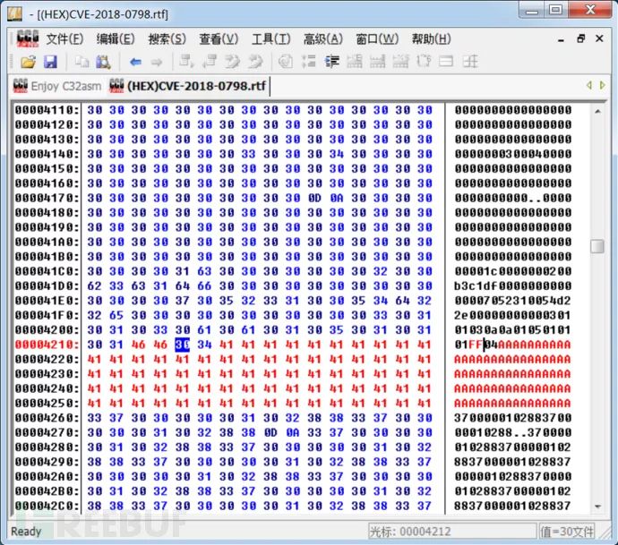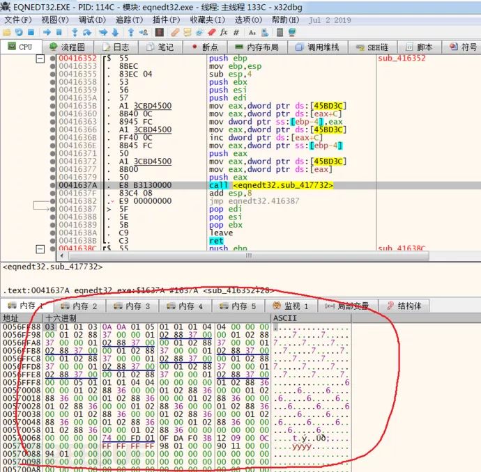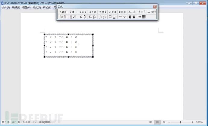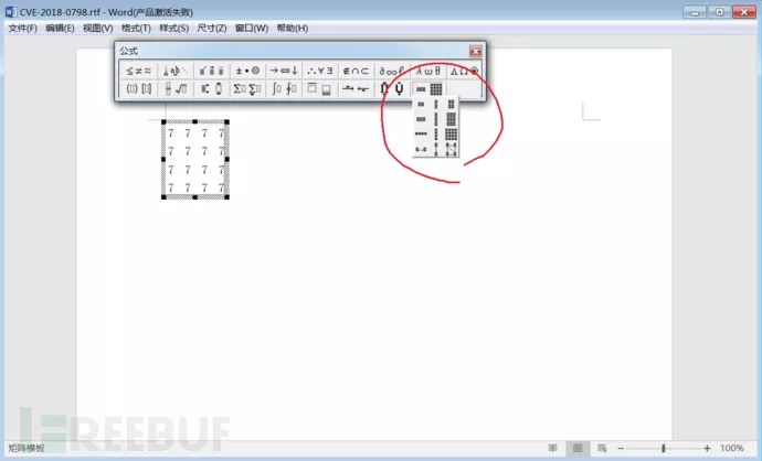 新建 RTF 文件,插入一个带有矩阵公式的公式编辑器对象(OLE),之后在 sub_443F6C 函数的首地址下断点,看看处理 Matrix 数据时是否走 sub_443F6C 函数这个流程。