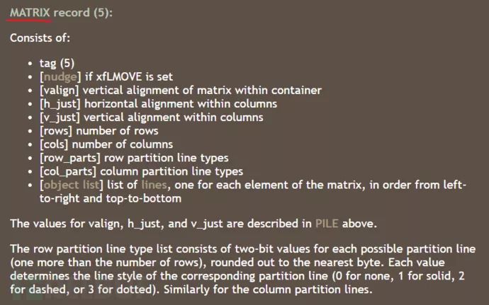 第二个是出问题的数据结构来自公式编辑器的 Matrix,查询一下发现有如下定义,从后面的分析中可以看出这个数据结构是专门用来处理公式编辑器中的矩阵公式的。