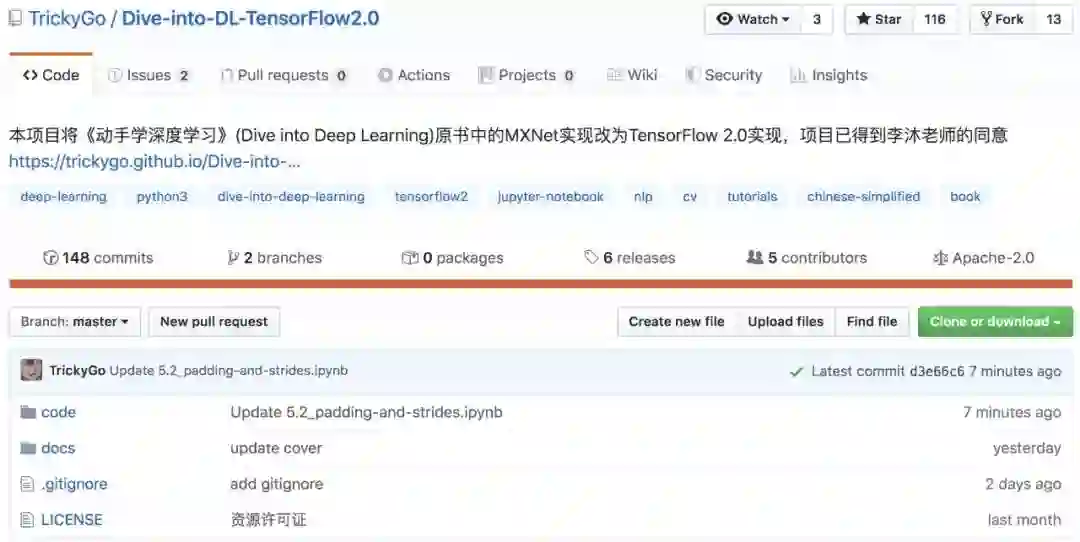 本项目将《动手学深度学习》(Dive into Deep Learning)原书中的MXNet实现改为TensorFlow 2.0实现,项目已得到李沐老师的同意。