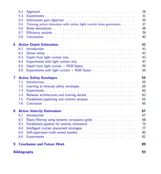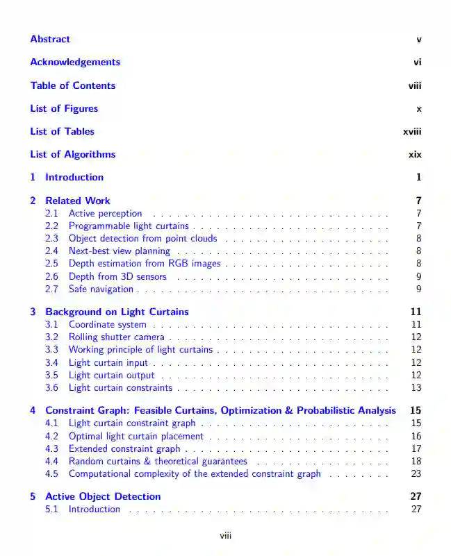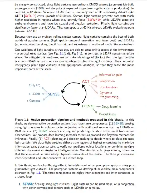 本文为利用可编程光幕进行机器人主动感知奠定了算法基础。我们研究了光幕在各种感知任务中的使用,如3D对象检测、深度估计、障碍物检测和规避以及速度估计。首先,我们将光幕的速度和加速度约束合并为约束图;这允许我们计算可行的光幕,优化任何特定任务的目标。然后,我们开发了一套算法,使用各种工具,如贝叶斯推理、深度学习、信息获取和动态规划,智能地在场景中放置光幕。