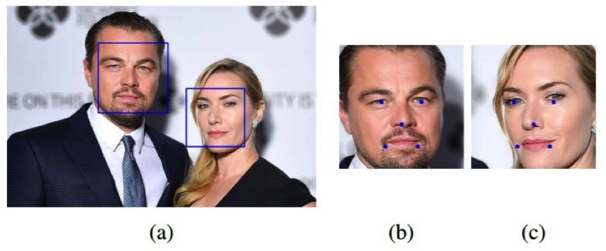 图 3:(a)人脸检测器找到的边界框。(b)和(c):对齐后的人脸和参考点。