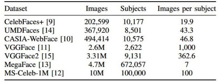 对于基于 CNN 的人脸识别方法,影响准确度的因素主要有三个:训练数据、CNN 架构和损失函数。因为在大多数深度学习应用中,都需要大训练集来防止过拟合。一般而言,为分类任务训练的 CNN 的准确度会随每类的样本数量的增长而提升。这是因为当类内差异更多时,CNN 模型能够学习到更稳健的特征。但是,对于人脸识别,我们感兴趣的是提取出能够泛化到训练集中未曾出现过的主体上的特征。因此,用于人脸识别的数据集还需要包含大量主体,这样模型也能学习到更多类间差异。[110] 研究了数据集中主体的数量对人脸识别准确度的影响。在这项研究中,首先以降序形式按照每个主体的图像数量对一个大数据集进行了排序。然后,研究者通过逐渐增大主体数量而使用训练数据的不同子集训练了一个 CNN。当使用了图像数量最多的 10000 个主体进行训练时,得到的准确度是最高的。增加更多主体会降低准确度,因为每个额外主体可用的图像非常少。另一项研究 [111] 研究了更宽度的数据集更好,还是更深度的数据集更好(如果一个数据集包含更多主体,则认为它更宽;类似地,如果每个主体包含的图像更多,则认为它更深)。这项研究总结到:如果图像数量相等,则更宽的数据集能得到更好的准确度。研究者认为这是因为更宽度的数据集包含更多类间差异,因而能更好地泛化到未曾见过的主体上。表 1 展示了某些最常用于训练人脸识别 CNN 的公开数据集。