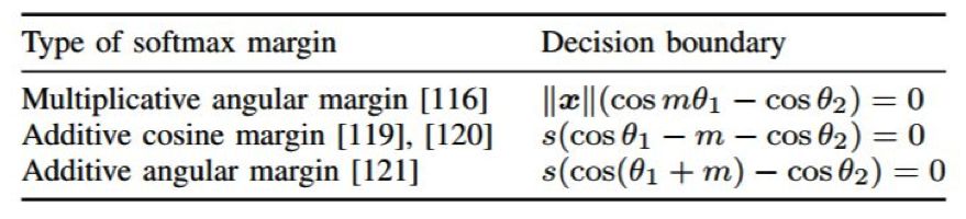 如图 8 所示,这个余量可以有效地增大类别之间的区分程度以及各自类别之内的紧凑性。根据将该余量整合进损失的方式,研究者们已经提出了多种可用方法 [116,119-121]。比如 [116] 中对权重向量进行了归一化以具有单位范数,这样使得决策边界仅取决于角度 θ_1 和 θ_2。[119,120] 中则提出了一种加性余弦余量。相比于乘法余量 [135,116],加性余量更容易实现和优化。在这项工作中,除了归一化权重向量,特征向量也如 [115] 中一样进行了归一化和比例调整。[121] 中提出了另一种加性余量,它既有 [119,120] 那样的优点,还有更好的几何解释方式,因为这个余量是加在角度上的,而不是余弦上。表 2 总结了有余量的 softmax 损失的不同变体的决策边界。这些方法是人脸识别领域的当前最佳。