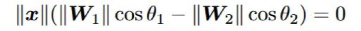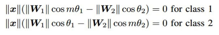 其中 x 是特征向量,W_1 和 W_2 是对应每类的权重,θ_1 和 θ_2 是 x 分别与 W_1 和 W_2 之间的角度。通过在上式中引入一个乘法余量,这两个决策边界可以变得更加严格: